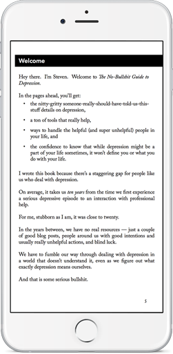 Go to this page on your iPhone or iPad, then the button below to download the ePub version of The No-Bullshit Guide to Depression.