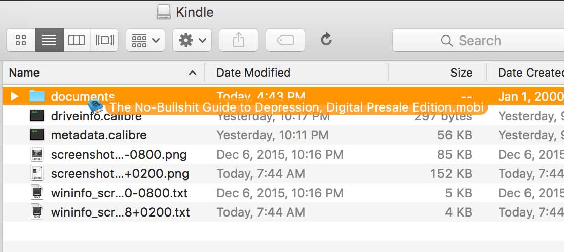 Open the Kindle drive on your computer, and then copy "The No-Bullshit Guide to Depression.mobi" to the documents folder in your Kindle.