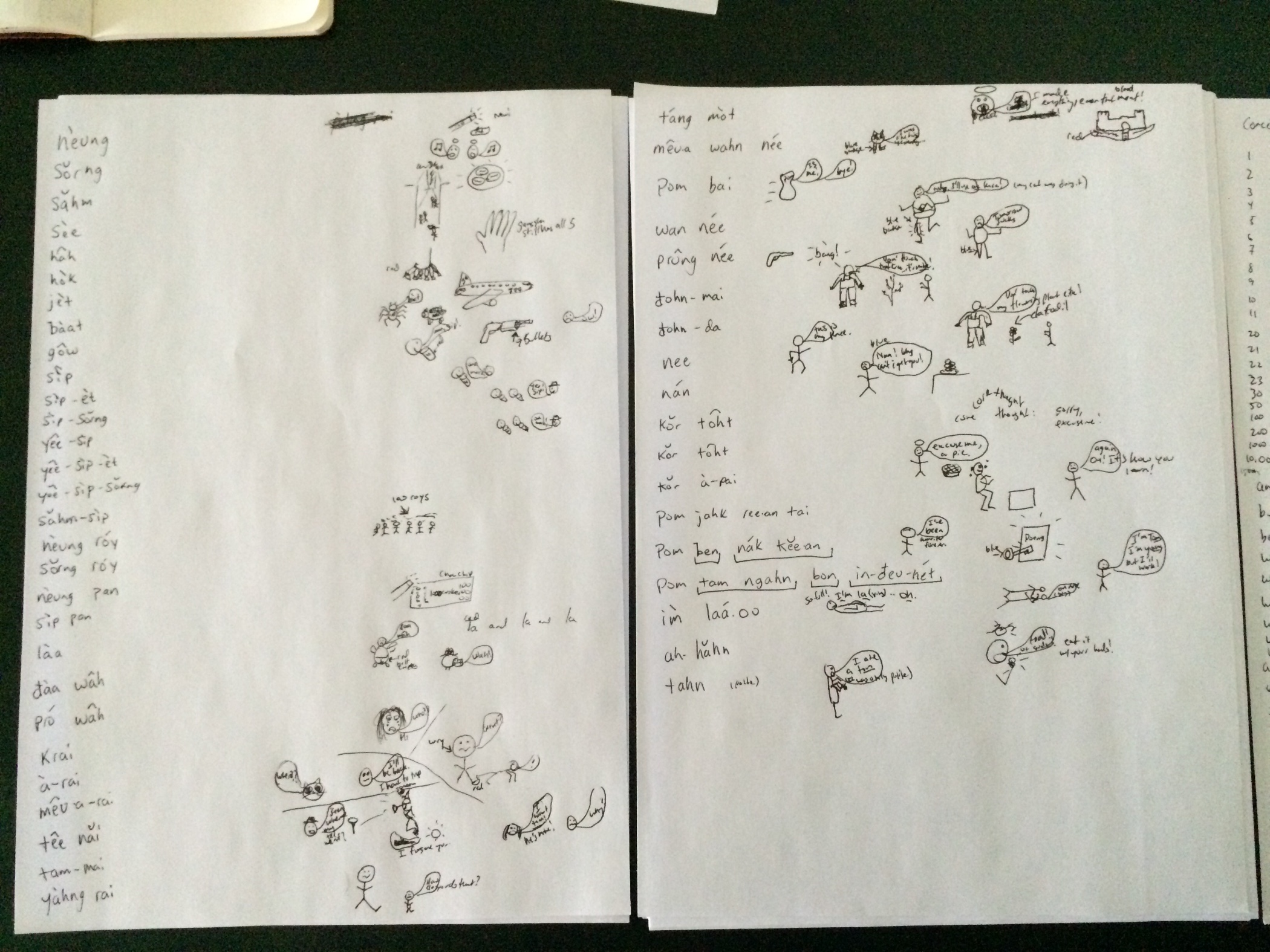 I'm this edition: numbers up to a million, conjunctions, who what when where why how, because, all, go, yesterday today tomorrow, this, that, sorry, pardon, i want to learn Thai, I'm a writer, i work on the internet, I'm full, food, and eat.